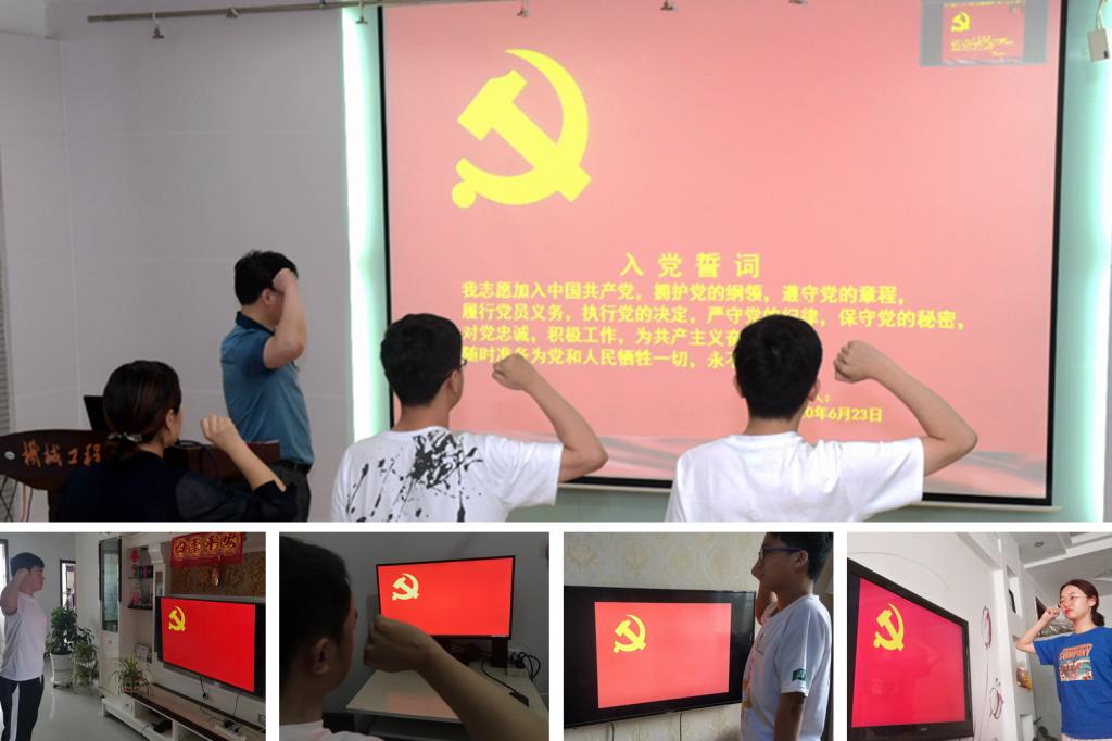 同志们在方俊的带领下宣读入党誓词,身处全国各地的新党员在宣誓时,将党旗投屏在自家电视屏幕上,面对鲜红的党旗庄严宣誓。誓言通过网络信号跨越千里,表达了新党员以优异的工作学习成绩为党的事业贡献力量,为伟大共产主义事业奋斗终身的誓言。