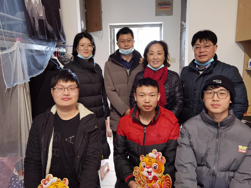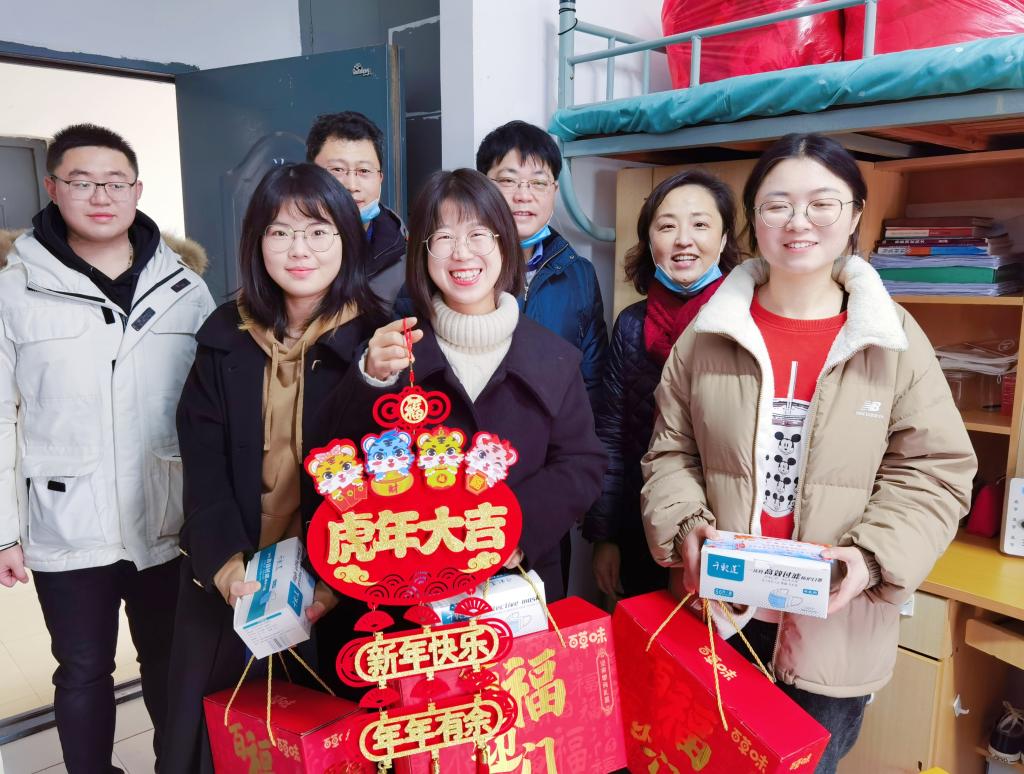 高雪梅带队走访宿舍并亲切询问学生留校生活与学习情况,叮嘱学生做好个人防护,注意宿舍安全,遵守学校各项疫情防控规定;多与父母联系,要视频拜年,关心家人健康;鼓励学生充分利用在校时间,度过一个充实、温暖、特殊的在校假期与春节。随后,老师们送上新春礼盒、新年挂饰、防疫物资、新年午餐券及新春祝福。同学们对老师们的殷切关心表示感谢,表示会遵守相关规定,常与家人联系,珍惜假期时间,不断充实自己。