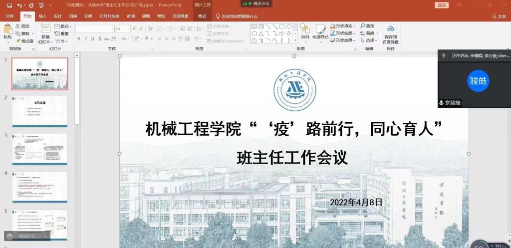 辅导员结合学校文件要求,向班主任解读在校学生管理规定,涉及常态化核酸检测、线上教学、就餐方式、外出就医方案、避免聚集性活动等。倡议班主任助力学工队伍,加强学生思想引领工作,教育学生严格遵守校内防疫要求。呼吁班主任下沉学生,关注重点学生群体—家庭经济困难、学业困难和心理问题学生,做到真心、贴心、细心。