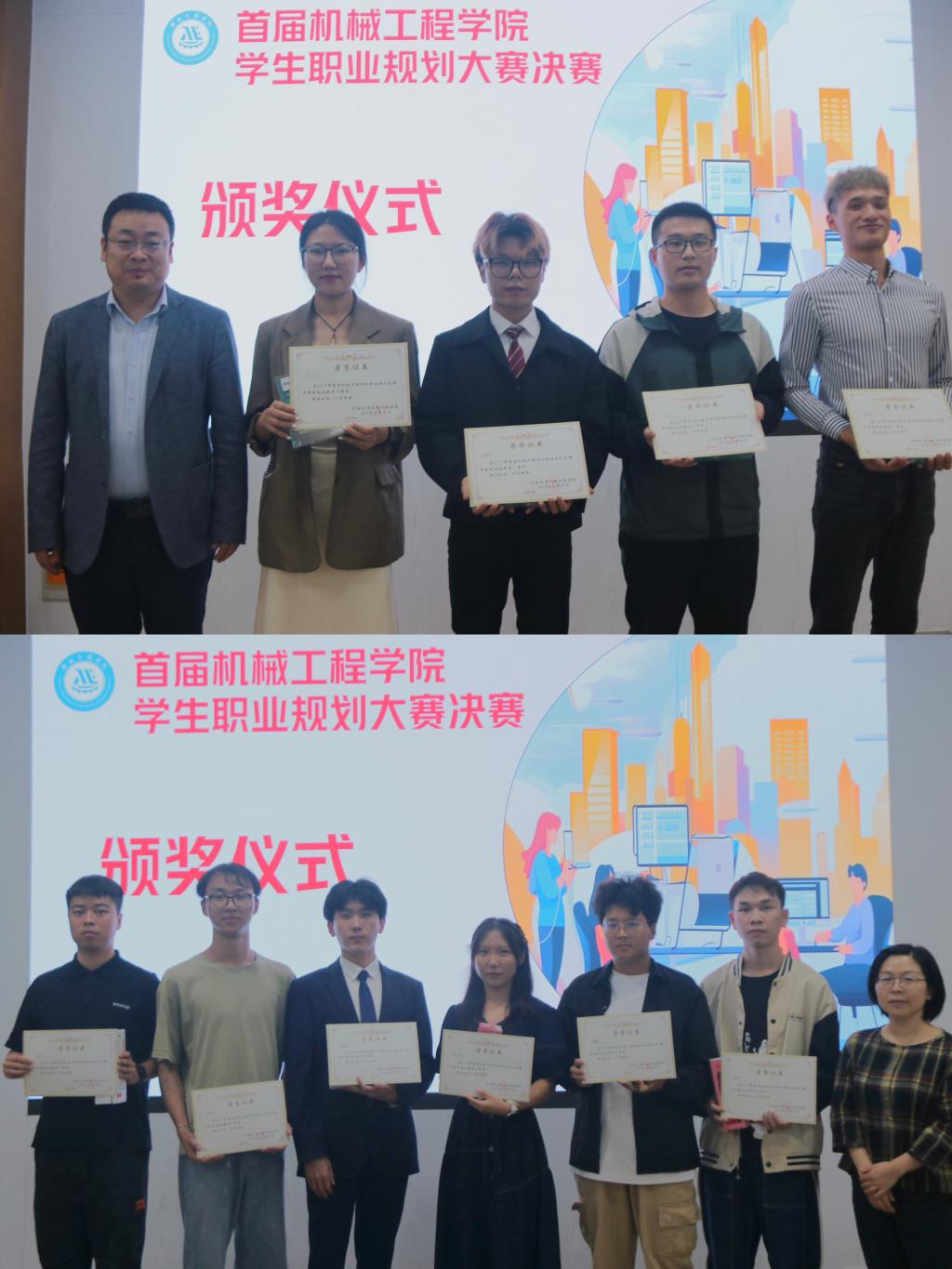 整场比赛持续了3个小时,现场有选手们自信满满的展示,也有评委们犀利的点评,更有观赛学生的雷鸣掌声。大赛最后,孟召双现场公布了获奖名单,刘阳、张驰获成长赛道一等奖,罗羽桐、曲茂东获就业赛道一等奖,魏晓枫、徐浦钦等6位同学分获各赛道二等奖,刘程元、王泽宇等8位同学分获各赛道三等奖。徐国伟、俞琪、刘升恒为获奖同学颁奖。
