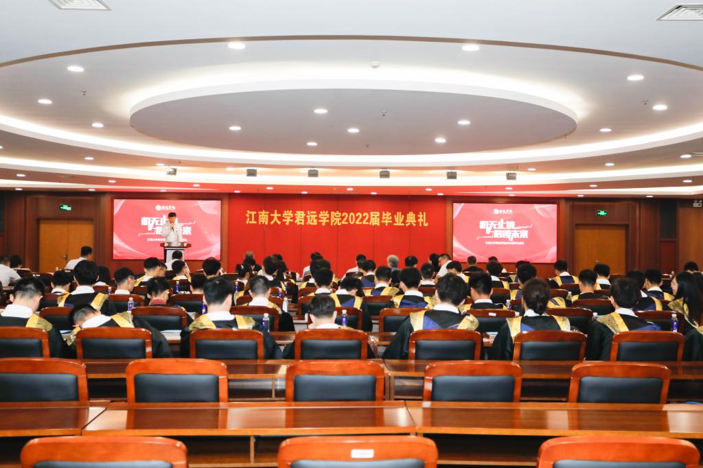 6月16日上午,tyc33455cc太阳成集团君远学院2022届毕业典礼在我校图书馆五楼报告厅举行。无锡市委统战部副部长、侨办主任、君远学院理事会理事赵俊明,上海唐君远教育基金会理事、原tyc33455cc太阳成集团副校长王武,上海唐君远教育基金会理事唐建年,tyc33455cc太阳成集团党委常委、副校长、君远学院理事会理事长堵国成,校党委常委、宣传部部长倪松涛,学生工作部部长张菁燕,教务处处长徐学明,招生就业处处长赵建新,社会资源处处长黄敏,党委统战部副部长王冰等领导和嘉宾,以及太阳成集团tyc33455cc、君远学院班子成员和部分教师代表参加了典礼仪式。学院辅导员高鑫主持仪式。