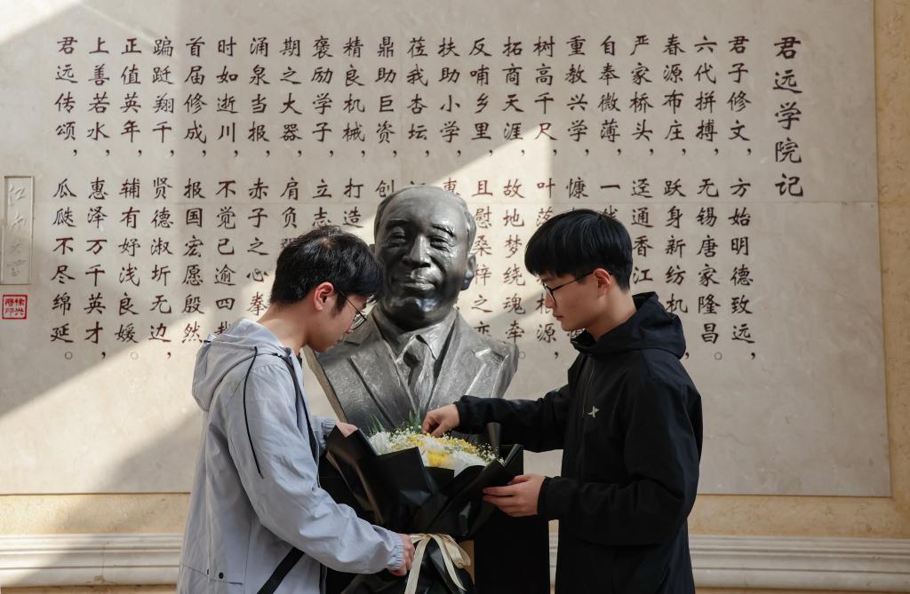 君远学院学生李明磊、刘俊超代表莘莘学子敬献鲜花,李可带领师生代表在塑像前三鞠躬致敬,再次表达对唐老先生的深切缅怀。唐翔千先生逝世五周年追思活动在肃穆的氛围中圆满结束。