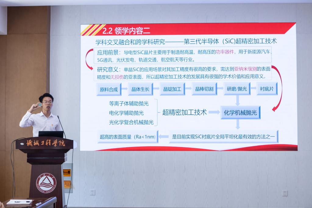 先进制造研究中心研究生第三党支部支委张权、陈宗昱、徐继龙依次对习近平总书记在中共中央政治局第三次集体学习时的讲话精神《切实加强基础研究,夯实科技自立自强根基》进行领学。张权领学习近平总书记论述加强基础研究的重要性的内容,结合课题组项目“以高精度电火花加工高压涡轮叶片气孔膜的研究”进行交流,介绍在致力解决航空发动机高压涡轮叶片气孔膜“卡脖子”问题上,课题组为C919大飞机换上“中国芯”的科研探索。陈宗昱领学习学科交叉融合和跨学科研究部分,现场展示课题组第三代半导体碳化硅晶片,介绍半导体材料的超精密加工技术和其中涉及的多学科交叉融合的知识。徐继龙领学加强基础人才培养部分,从高层次基础人才平台体系建设、“强基计划”等人才计划实施、人才差异化评价和长周期支撑机制完善、加强科研学风作风建设等展开分点解读。
