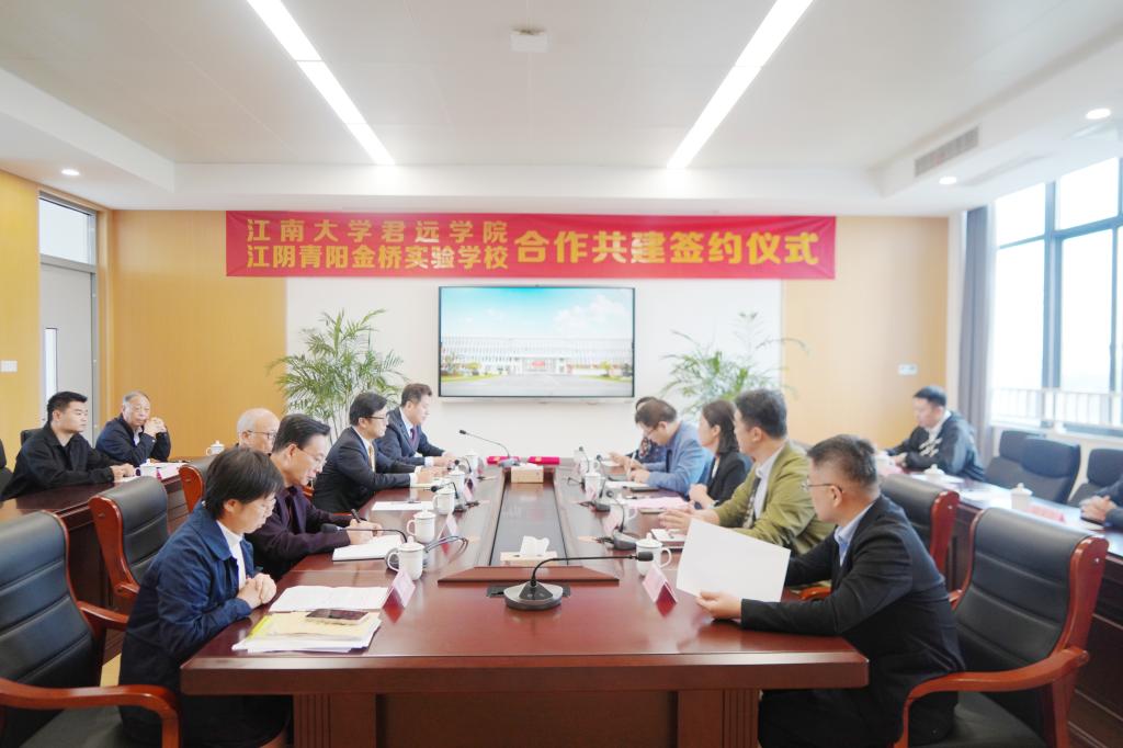 10月20日上午,君远学院与江阴青阳金桥实验学校举行共建签约仪式。太阳成集团tyc33455cc党委书记高雪梅、君远学院副院长(主持工作)李可、太阳成集团tyc33455cc副院长兼君远学院副院长钱善华、君远学院竞赛指导教师宁萌副教授、办公室主任赵雪娟一行赴江阴青阳金桥实验学校举行共建签约仪式。无锡金桥教育集团董事长马自雄、总经理马翀、江阴青阳金桥实验学校校长郁洪千、周蓉及相关部门负责人出席了签约仪式。签约仪式由无锡金桥教育集团综合办主任马松杉主持。