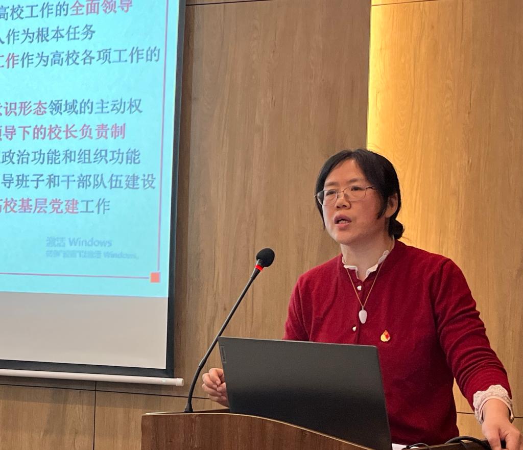 首先,田卫平作了《增强党支部政治功能与组织功能推动党建与事业深度融合》专题报告。她提纲挈领地解读了新时代党的建设总要求,阐释了学校基层组织工作重要性并介绍学校党建双创情况,并围绕学院党建项目今后努力方向给出了建议。