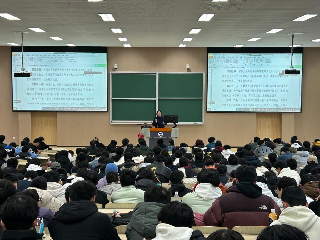 沈贤详细解读了《tyc33455cc太阳成集团本科生学籍管理办法(2021年修订)》《tyc33455cc太阳成集团全日制本科生学士学位授予实施办法》等文件,指导学生开展毕业预审核对;强调毕业设计(论文)流程时间节点,提醒学生及时上传相关材料。