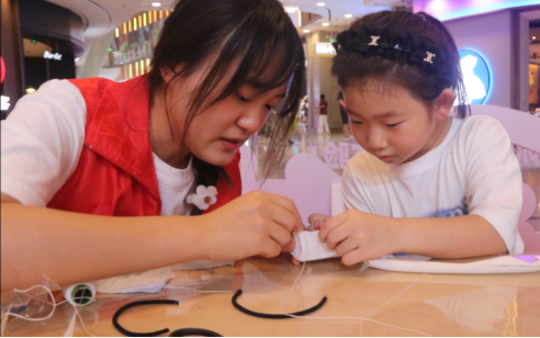活动现场,团队成员刘淑涵对一位小朋友的出色表现赞不绝口,“哇塞,小朋友,这是你第一次做针线活吗?完成的太棒了!”而小朋友的回答则充满了对未来实践的憧憬与自信,“是的!姐姐,我学会之后在家也可以用旧衣服做发箍啦。”小朋友表示要将这份新技能带回家中,继续用旧衣物创造更多可能。实践团也正是以这样的实际行动,践行着“聚沙成塔”的理念,将每一次微小的努力汇聚成推动社会绿色先行的力量,这也是他们矢志不渝的初心所在。