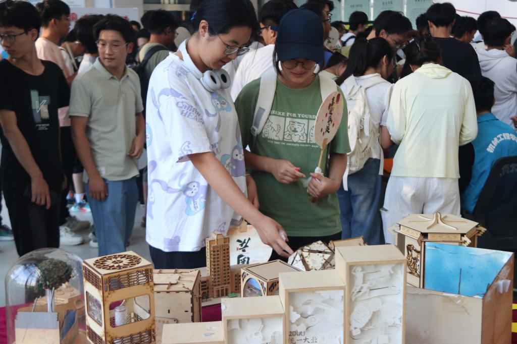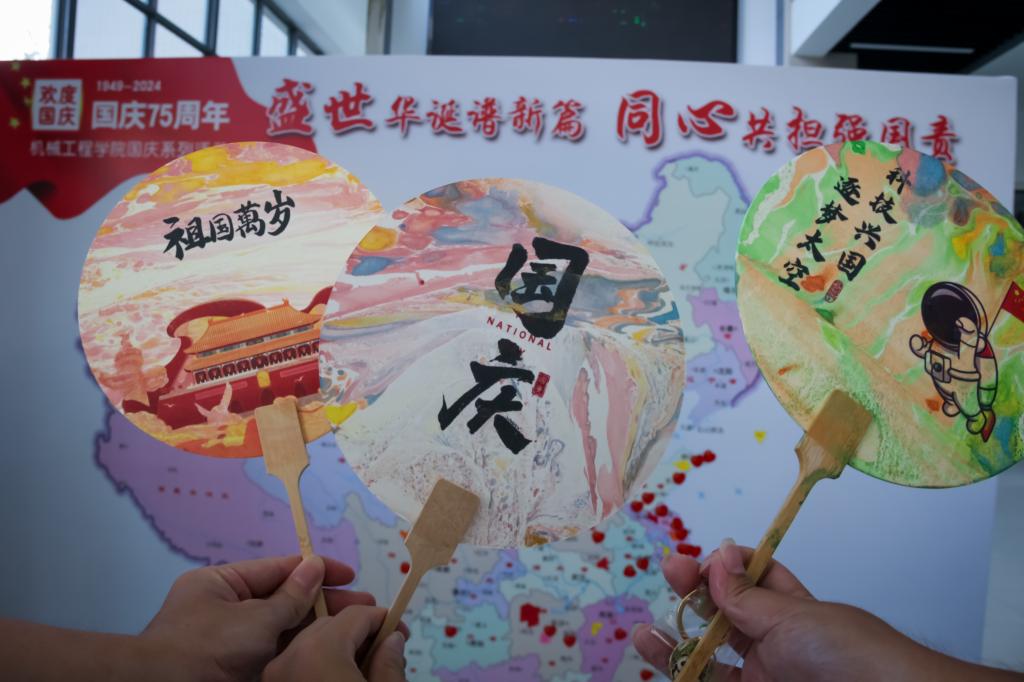 巧手匠心,祝福祖国。现场工作人员向同学们详细介绍了漆扇的历史渊源、制作技艺以及漆扇背后所承载的文化价值。领取印有国庆祝福字样的纸扇后,同学们从选色、滴色、搅拌染料,再到纸扇的印染,一边交流一边制作,共同探索漆扇艺术的无限可能。经过一个多小时的努力,一幅幅美轮美奂的漆扇作品呈现眼前。刻章的地方宛如一个充满魅力的艺术角落,精美的章料、刻刀摆放次序井然,同学们用自己的创意镌刻出对祖国深沉的热爱,有同学精心设计了以“75周年”为主题的印章,用动感的线条诉说着对和平的向往,对九州繁荣的期许,有同学将山河壮丽景观融于印章中,用蜿蜒的长城、奔腾的长江诉说着山河无恙,岁月静好……作品完成后,同学们将成品印章通过贴纸盖章的形式展现在作品展示板上,为祖国献上真挚的祝福。