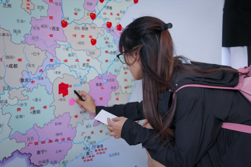 翰墨抒怀,礼赞祖国。在工作人员的指导下,同学们在拼图上选择自己家乡的省份,用彩色卡纸描绘并裁剪,将其贴在作品展示板上,并在空白区域写上对祖国、对家乡的祝福。镜头前,家乡的美食美景是学生如数家珍的回忆,侃侃而谈中无一不是对家乡的思念与热爱。活动现场还设置了贺卡祝福环节,彩带上的一张张贺卡承载了同学们对祖国深深的祝福与当代青年的责任担当。《醒狮》等书画作品更是同学们情感的载体,展现了对祖国母亲的永恒情谊。