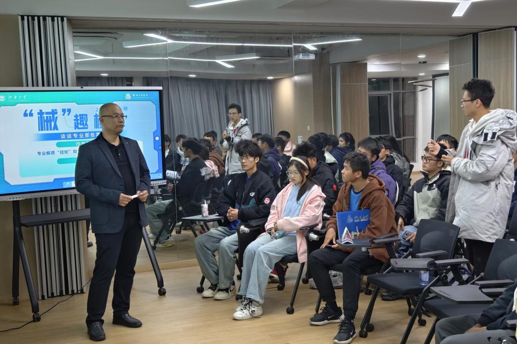 交流环节,同学们热情不减,踊跃地向于老师请教机械工程专业的课程设置、科研准备以及大创项目方向等问题。于老师都一一给予了详细且专业的解答,同时他鼓励在座同学们要重视基础课程学习、夯实专业基础,在深度思考与躬身实践的双重磨砺中精准探寻自身的兴趣所在。