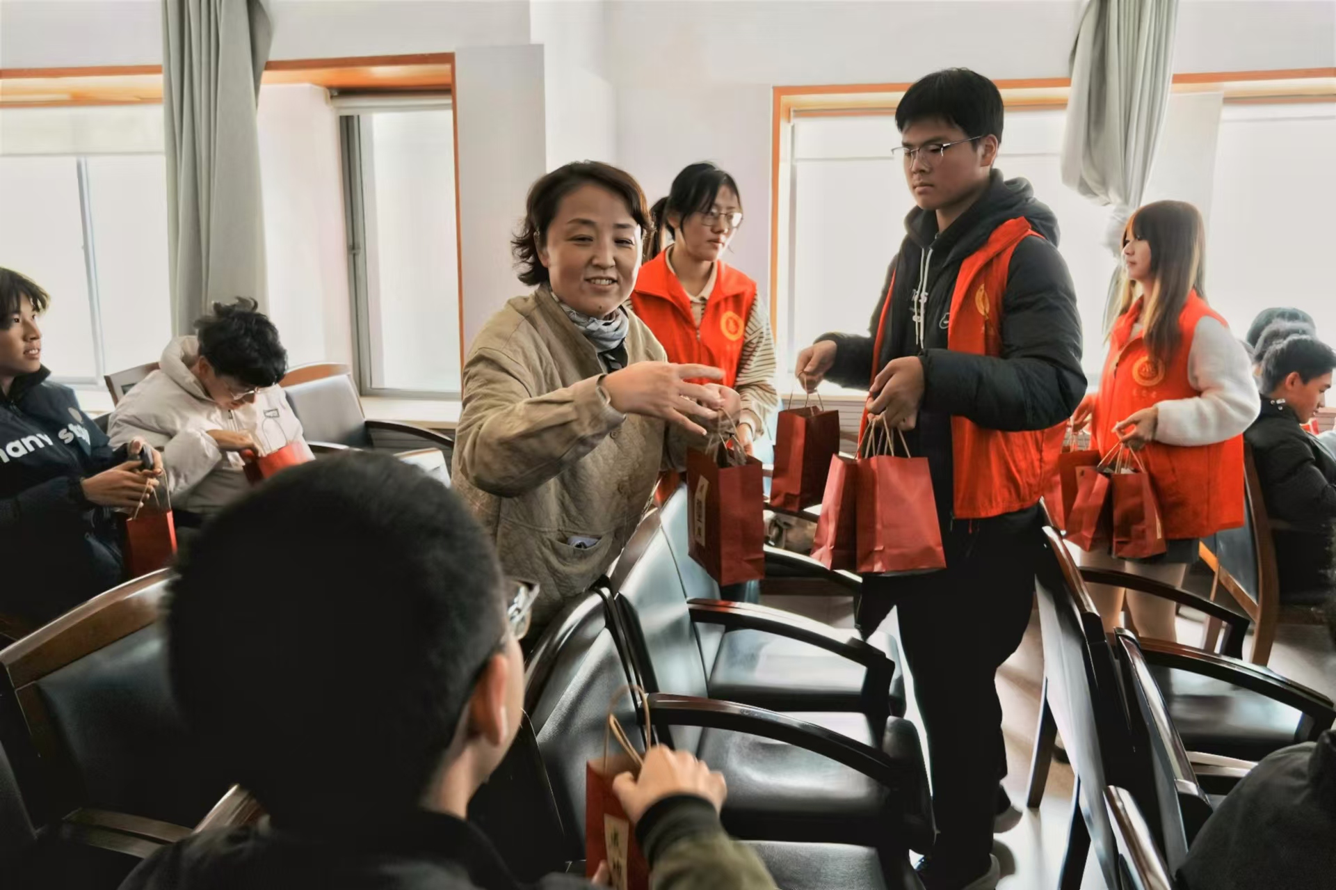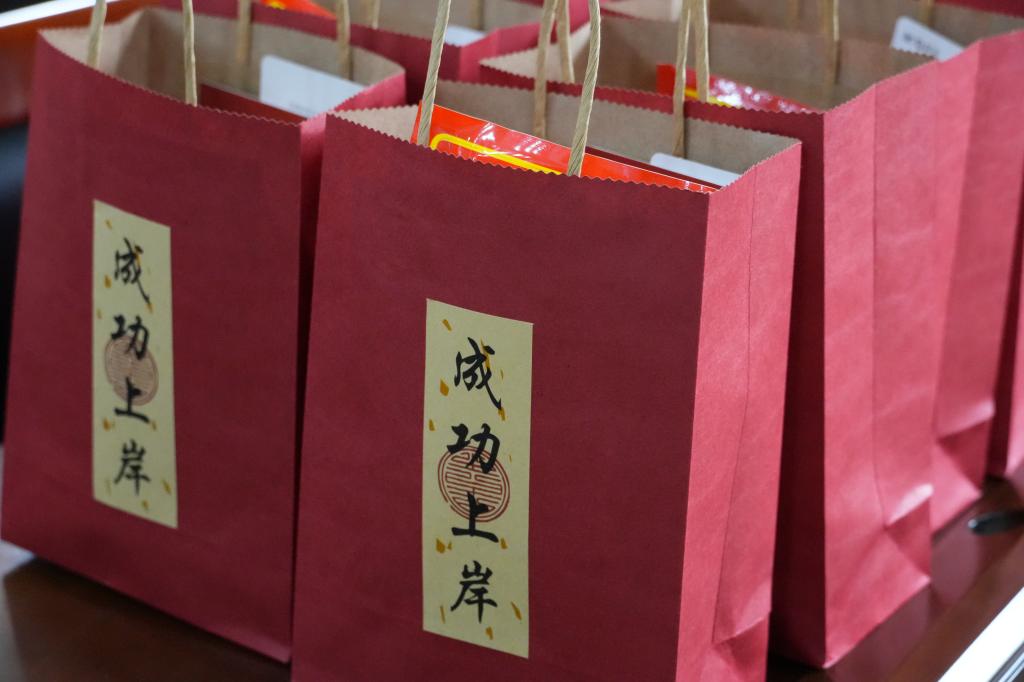 随后,老师们发放精心准备的考研加油包,定制礼包中有七件爱心礼品,包括寓意“牛气冲天”的牛奶、“苹”安上岸的苹果、前“橙”似锦的橙子、“棒”上有名的棒棒糖,“暖心暖意”的暖宝宝、“一举夺魁”的祈福文具以及班主任老师手写的加油明信片。每一件礼物都承载着学院对考研学子美好的祝愿、温暖的慰问和殷切的期望。