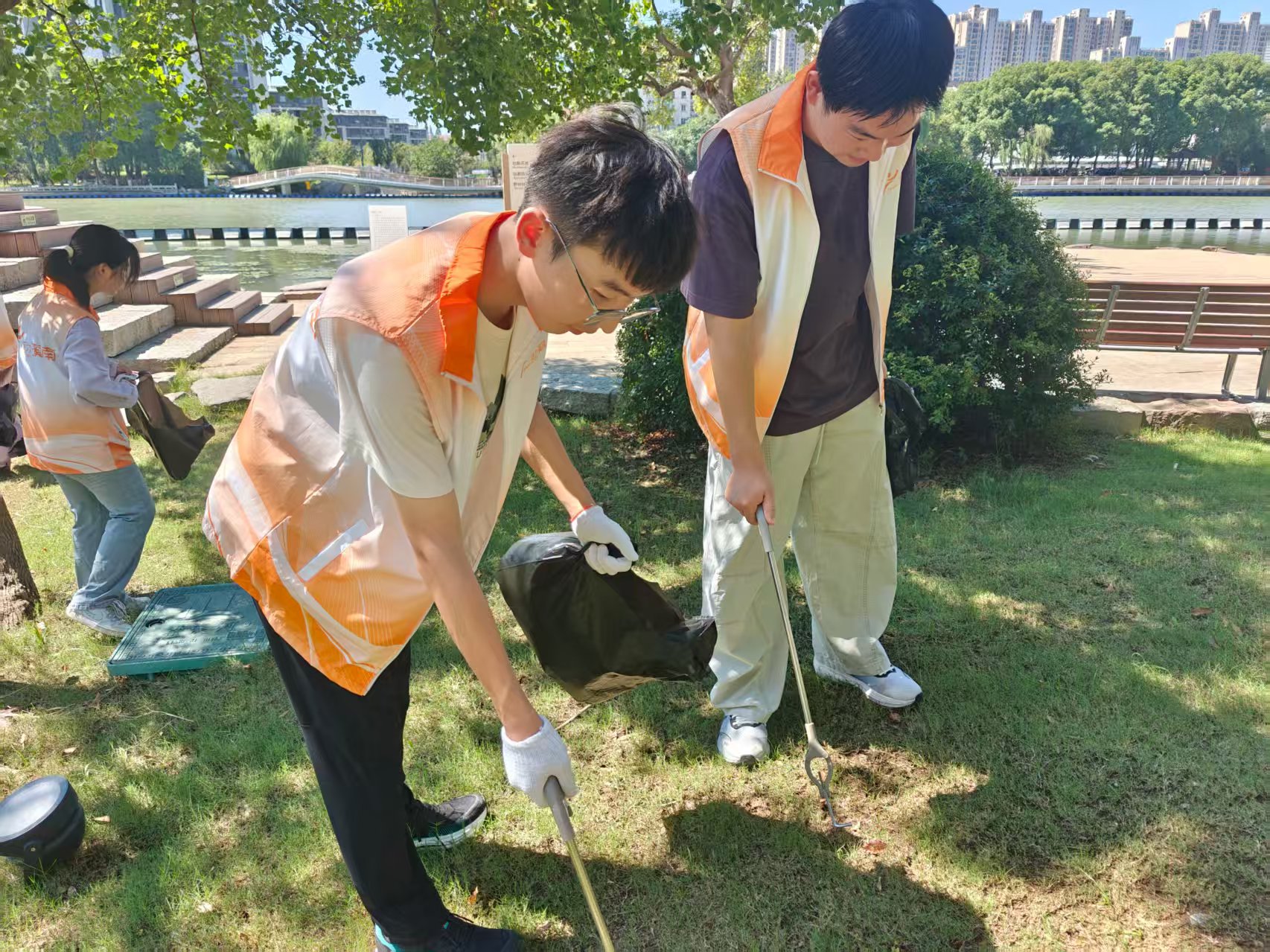 实践队成员在公园内捡拾垃圾
