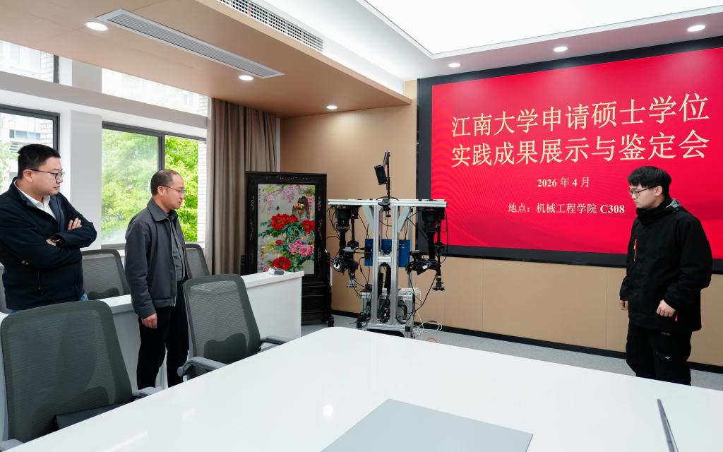 会上,宋智功教授指导的硕士研究生黄嘉昕作题为《面向轮式双臂机器人的具身智能数采装备研制及控制方案》的实践成果汇报,并在现场展示了实践成果的样机和技术特点。围绕零可达智能科技无锡有限公司的实际需求,针对工业具身智能机器人在非结构化环境中面临的高质量数据稀缺、双臂协同控制复杂以及高层认知与物理交互存在鸿沟等行业痛点,系统开展了方案分析、算法设计、样机研制和实验验证等工作,完成了从方案设计到样机调试的完整实践过程。在成果鉴定环节,专家组一致认为,该实践成果工程背景明确、技术路线清晰、关键技术创新点突出、成果完成度高,对企业的工业具身智能应用落地具有重要的支撑作用,已达到工程类专业学位硕士研究生的培养要求,整体水平优秀。